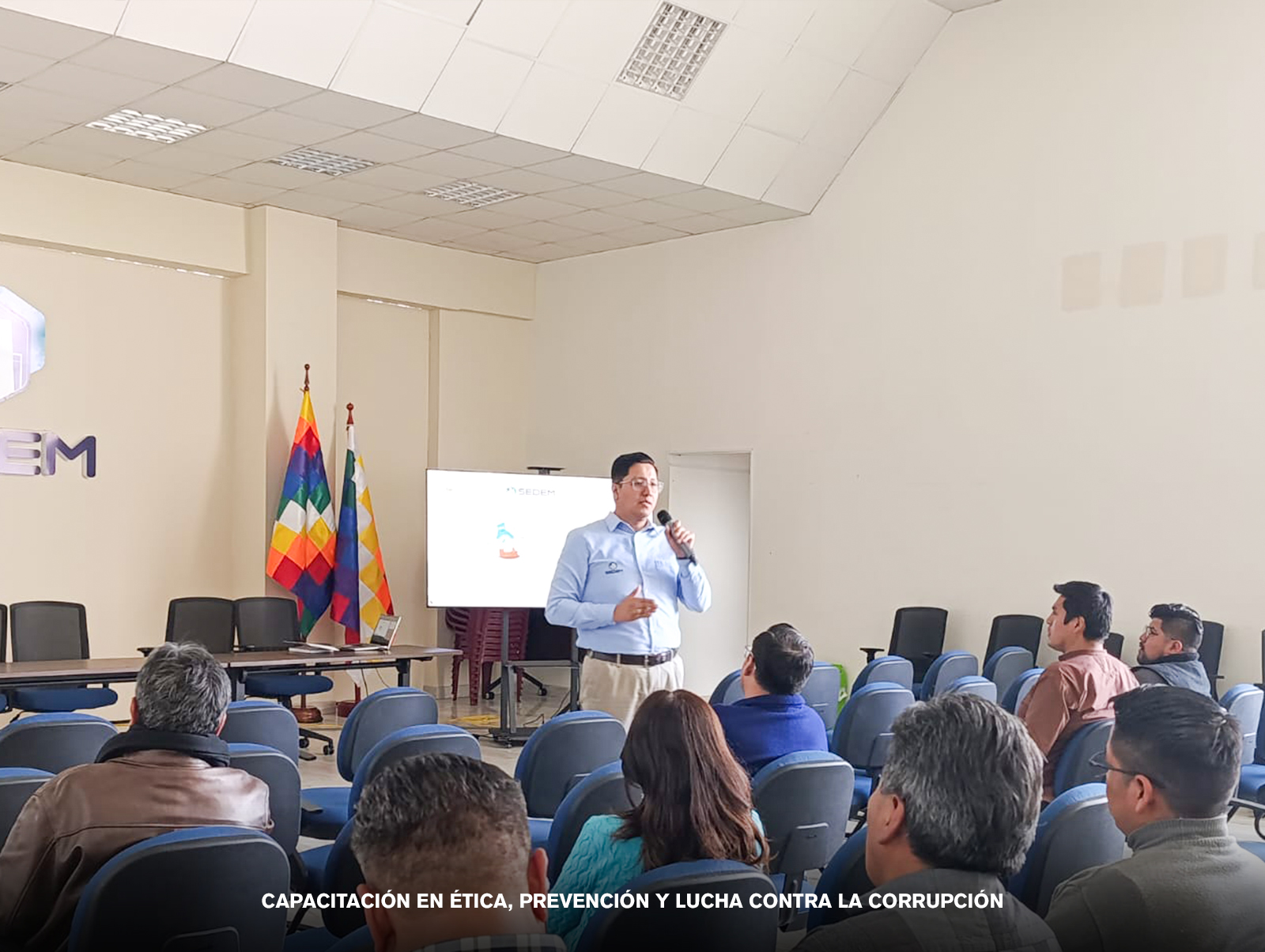 El Servicio de Desarrollo de las Empresas Públicas Productivas (SEDEM), a través de su Unidad de Transparencia y Lucha Contra la Corrupción, llevó a cabo la capacitación “Ética, Prevención y Lucha contra la Corrupción”, dirigida a servidoras y servidores públicos de la institución. La actividad se realizó el 27 de febrero de 2026, en el auditorio institucional, y contó con la participación de 53 funcionarios, quienes fortalecieron sus conocimientos en el marco normativo vigente, incluyendo la Constitución Política del Estado y las Leyes N° 004, N° 974 y N° 1390.